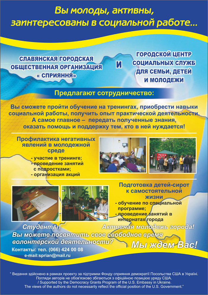 Слов'янська міська громадська організація «Сприяння» оголошує набір волонтерів для участі в проекті: "Активізація волонтерського руху в м.Слов’янськ", що реалізуеться при підтримці Фонду сприяння демократії Посольства США.