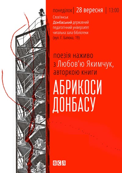 Про все це і про те, що «там, де не ростуть абрикоси, починається Росія» - на зустрічі з поетесою Любою Якимчук та на презентації її збірки «Абрикоси Донбасу», що вийшла у «Видавництві Старого Лева». Спробувати «Абрикоси Донбасу» Люби Якимчук на смак, слух і на дотик можна буде у Слов'янську в понеділок, 28 вересня, у читальній залі бібліотеки Слов'янського державного педагогічного університету (вул. Г. Батюка, 19). Початок о 13:00. Вхід вільний.