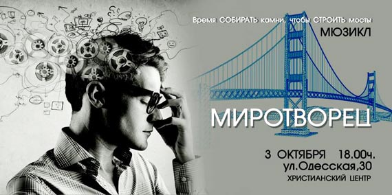 Мир с Богом, мир с самим собой, мир с другими людьми - возможно достичь, если познакомиться с МИРОТВОРЦЕМ! Только Он в состоянии примирить всех! Кто Он? Агент 007? Супермен? Ничего общего с Голливудом и политикой!
