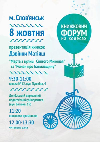 У Слов’янськ, Краматорськ, Дружківку та Костянтинівку, Бахмут вирушає «Книжковий форум на колесах» з письменницею Дзвінкою Матіяш, яка презентуватиме дві чудові книжки "Марта з вулиці святого Миколая" і "Роман про батьківщину".