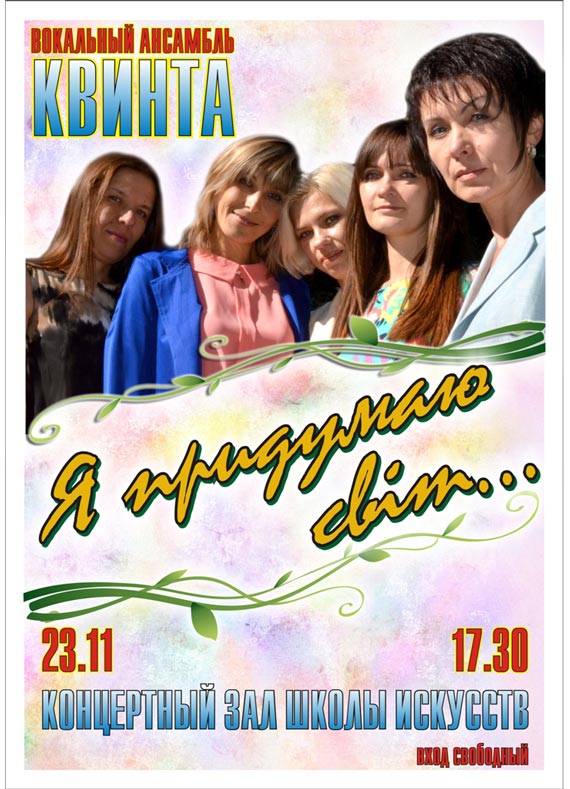 Запрошуємо всіх поціновувачів музики на концерт вокального колективу "Квинта". Спів акапела, цікавий репертуар і звичайно ж приємні сюрпризи. Концерт відбудеться в школі мистецтв 23 листопада о 17.30. Вхід вільний. Приходьте, буде цікаво!