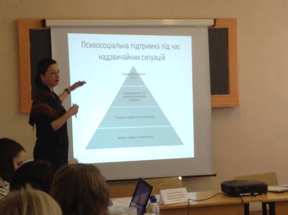 Керівник Центру психосоціальної реабілітації НаУКМА в Слов‘янську Тетяна Асланян презентувала модель психосоціальної підтримки під час надзвичайних ситуацій. Разом визначили місце присутніх фахівців в системі допомоги постраждалим.