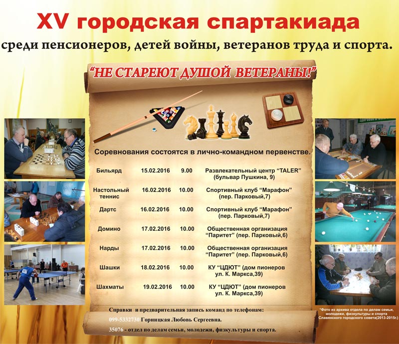 Отдел по делам семьи, молодежи, физической культуры и спорта приглашает жителей г.г.Славянск, Николаевка и Святогорск принять участие в ХV городской спартакиаде среди пенсионеров, детей войны, ветеранов труда и спорта.