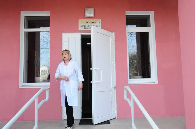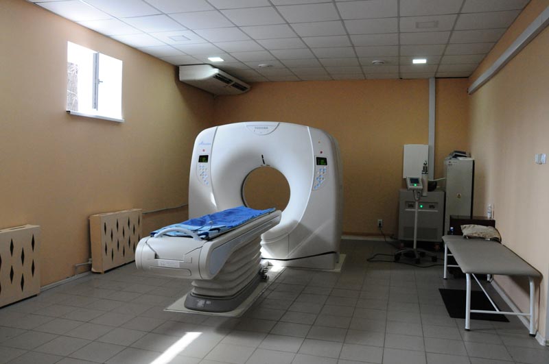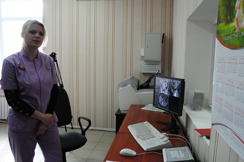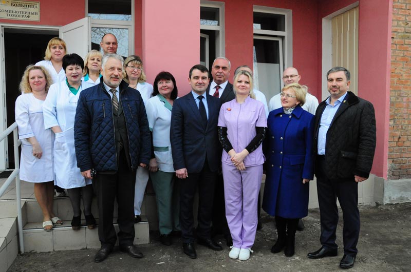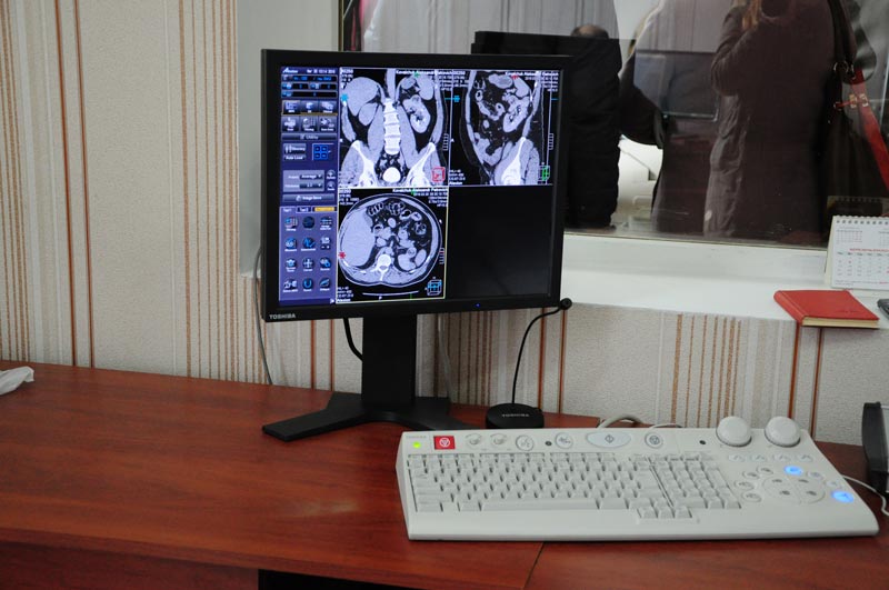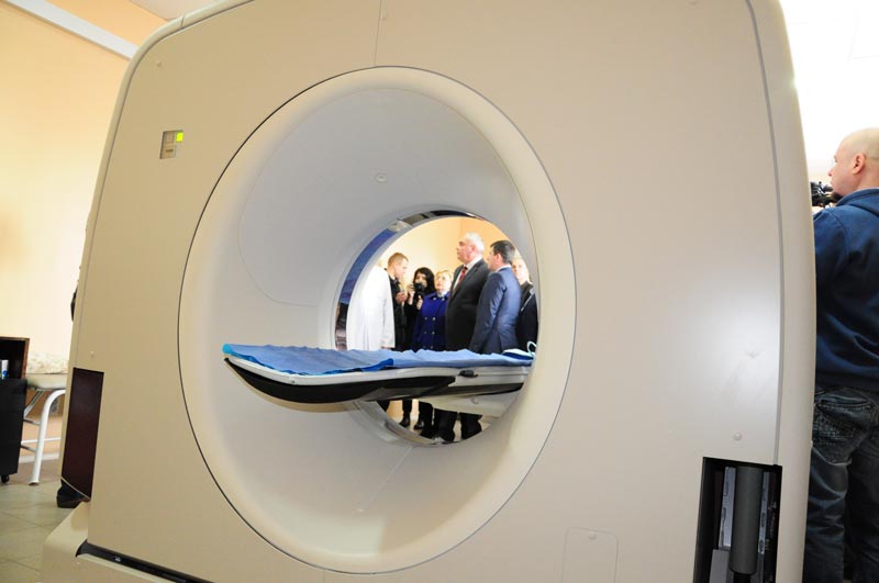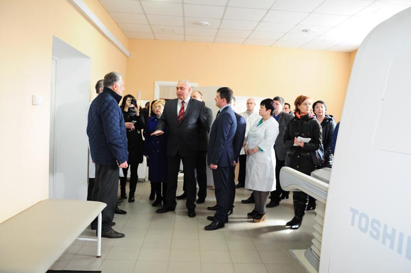 Делегація у супроводі головного лікаря Володимира Степанова направилася до рентгенологічного відділення, де усі мали змогу оглянути томограф. Як розповіла завідуюча рентгенологічним відділенням Тетяна Ставніча з 1 лютого обстеження пройшли 248 людей, нажаль, у 45 осіб виявлено пухлини.
