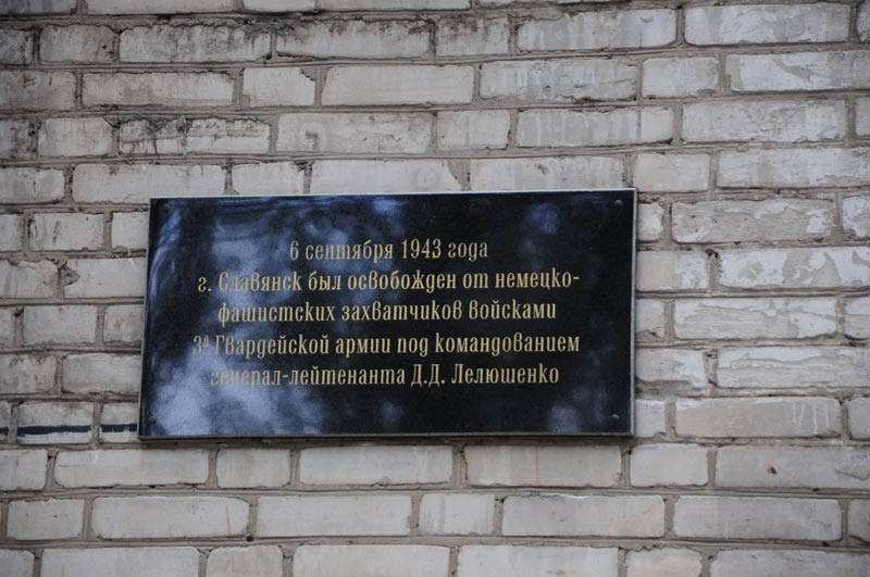 На дошці написано: “6 вересня 1943 року місто Слов'янськ був звільнений від німецько-фашистських загарбників військами 3 Гвардійської армії командування генерала-лейтенанта Д.Д.Лелюшенко”.