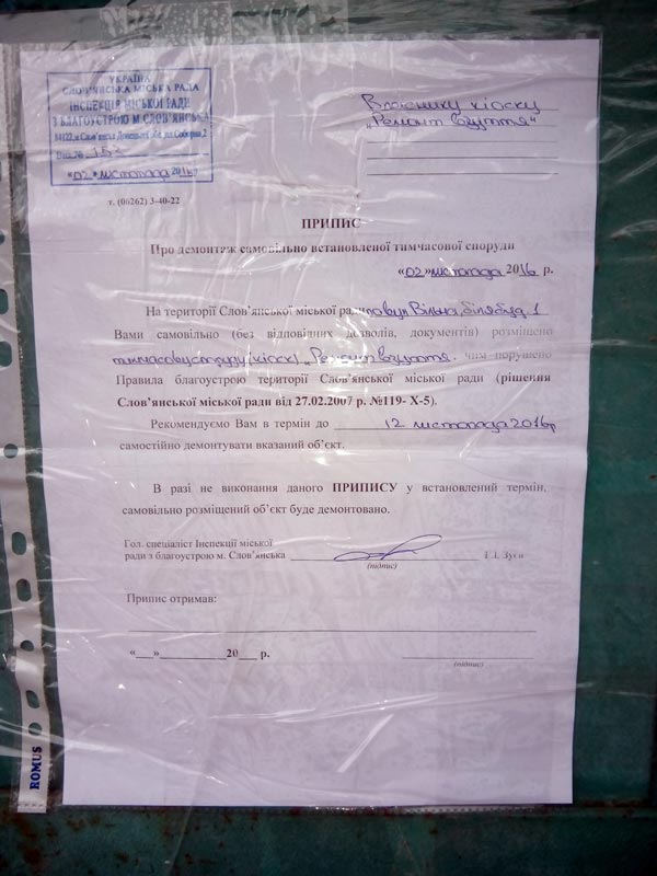 02.11.2016 року, був зафіксований факт самовільно встановленої тимчасової споруди кіоску «Ремонт взуття» (власник не відомий) по вул.Вільна (біля будинку №1), м.Слов’янська, чим порушено п.2.2. Правил благоустрою території Слов’янської міської ради.