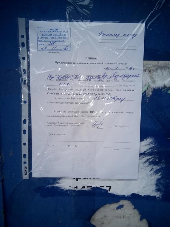 18 листопада був зафіксований факт самовільно встановленої тимчасової споруди кіоску (власник не відомий) по вул.Світлодарська біля буд. №13 чим порушено п.2.2. Правил благоустрою території Слов’янської міської ради.