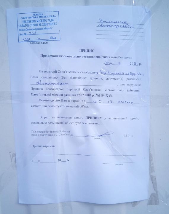 30 листопада був зафіксований факт самовільно встановленого автопричепа (власник не відомий) по вул.Торська (біля буд. №53а) м.Слов’янська чим порушено п.2.2. Правил благоустрою території Слов’янської міської ради.