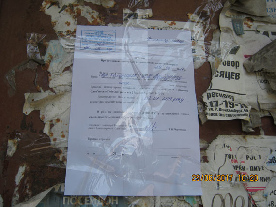У відповідності з рішенням виконавчого комітету Слов’янської міської ради від 12.09.2016 № 632 «Про затвердження Порядку виявлення, демонтажу, обліку, зберігання самовільно встановлених тимчасових споруд для провадження підприємницької діяльності на території міста Слов’янська та подальшого розпорядження ними», самовільно встановлена тимчасова споруда буде демонтовано примусово в установлений строк.