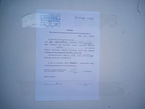 Слов'янська міська рада повідомляє, що 11 вересня 2017 року, по вул.Лозановича (район “Квіткового ринку”), була виявлена тимчасова споруда (кіоск) власник якої не відомий, про що складено Припис №303 від 13.09.2017р. «Про демонтаж самовільно встановленої тимчасової споруди», згідно з п.2.2. Правил благоустрою території Слов’янської міської ради (затв. Рішенням Слов'янської міської ради від 27.02.2007 р. №119-Х-5) та на виконання рішення виконавчого комітету Слов’янської міської ради від 12.09.2016 № 632 «Про затвердження Порядку виявлення, демонтажу, обліку, зберігання самовільно встановлених тимчасових споруд для провадження підприємницької діяльності на території міста Слов’янська та подальшого розпорядження ними», самовільно встановлена тимчасова споруда буде демонтована примусово.