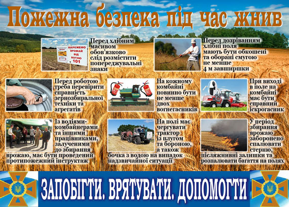 Пора жнив особливий пожежонебезпечний період. Загрозливу обстановку створюють спекотна погода, сухі хліба, енергонасичені хлібозбиральні агрегати, які нерідко знаходяться у несправному стані, а також людська недбалість та безвідповідальність. Працівники сільського господарства докладають багато зусиль, щоб посіяти та виростити врожай зернових.