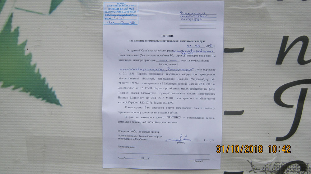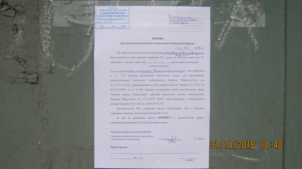 На території Слов'янської міської ради по вул.Ком’яхова (навпроти буд.63), 31.10.2018р. виявлені самовільно встановлені тимчасові споруди для здійснення підприємницької діяльності: «Прием стеклотары», «Вторсырье» (власники споруд не відомі), чим порушено п.5 Р. VІІІ Типових правил благоустрою території населеного пункту, затверджених Наказом Мінрегіонбуду від 27.11.2017 №310 та зареєстрованих в Міністерстві юстиції України 18.12.2017 за №1529/31397.