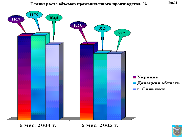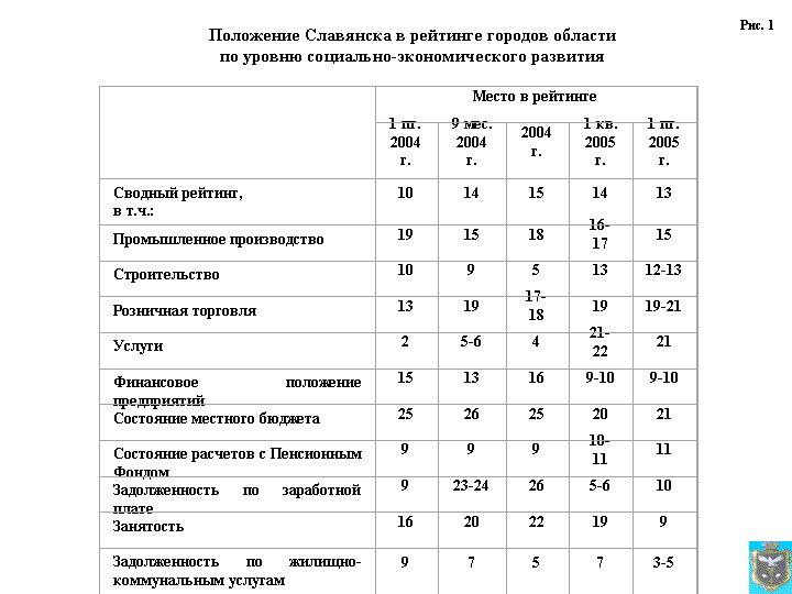 (рис. 1) В сводном рейтинге 28 городов Донецкой области по уровню социально-экономического развития по итогам 1-го полугодия т.г. город занял 13-е место, тогда как в 1-м полугодии 2004 г. было 10-е место, в промышленном производстве — 15-е место (было 19-е).