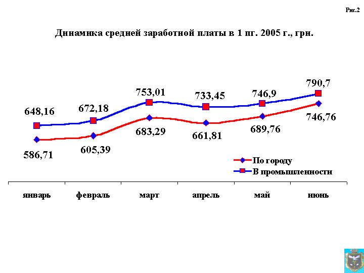 (рис. 2) Активизация экономической деятельности позитивно отражается на уровне жизни населения. Так, средняя заработная плата одного штатного работника в 1-м полугодии 2005 года составила 661,13 грн., в июне текущего года — 746,76 грн., что больше июня прошлого года на 31,2 %.