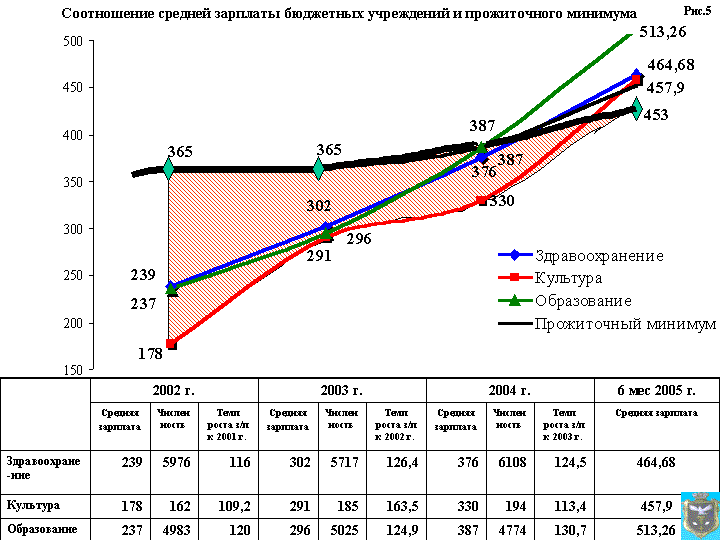 (рис. 3) Если на протяжении 2002 –2004 гг. средняя заработная плата работников образования, здравоохранения и культуры была ниже прожиточного минимума, то по итогам 1-го полугодия текущего года она превысила этот показатель.