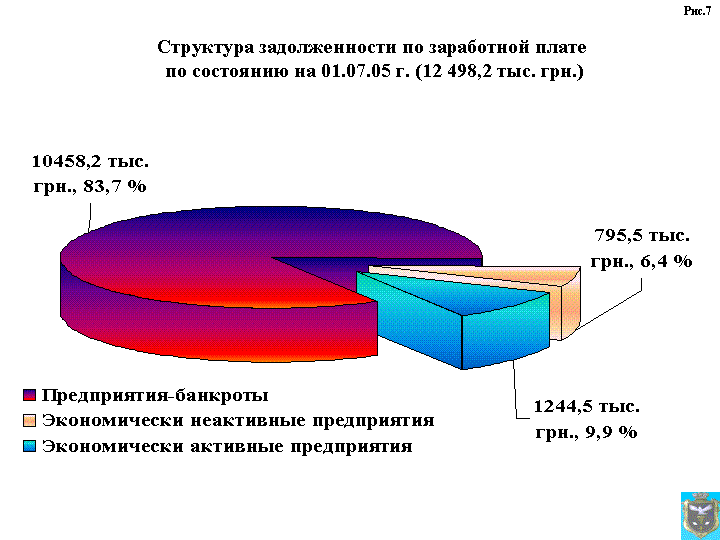 (рис. 5) Общая сумма невыплаченной зарплаты с учетом экономически активных предприятий, субъектов хозяйствования, по отношению к которым реализуются процедуры восстановления платежеспособности должника или признания его банкротом, а также экономически неактивных предприятий, по сравнению с 1 января 2005 г. уменьшилась на 157,6 тыс. грн. или на 1,2 %, по сравнению с июнем текущего года — на 124,3 тыс. грн. или на 1,0 % и составила 12 498,2 тыс. грн.