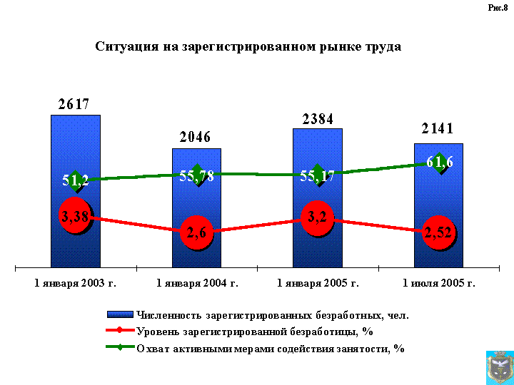 (рис. 6) Активными мероприятиями содействия занятости охвачено 2957 чел., то есть 61,6% незанятого населения (за 1 полугодие 2004 г. — 2103 чел. и 43,8 % соответственно). Трудоустроено 1299 чел., из них 137 чел. из социально незащищенных категорий граждан.