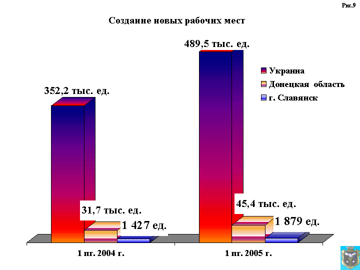 (рис. 7) За отчетный период за счет всех источников финансирования создано 1879 новых рабочих мест (при годовом задании 4212, выполнение составило 44,6 %), в том числе: 630 — на действующих предприятиях, 475 жителей города открыли собственную предпринимательскую деятельность, из них 70 — безработные. Зарегистрировано 719 трудовых соглашений с наемными работниками.