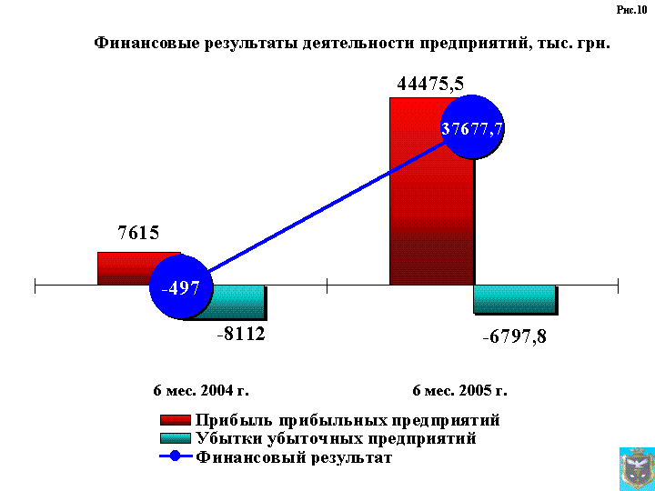 (рис. 8) Позитивные результаты дала проведенная горисполкомом совместно с налоговой инспекцией работа по уменьшению убыточности предприятий. За отчетный период по городу получен положительный финансовый результат от обычной деятельности в сумме 37,7 млн. грн., за соответствующий период прошлого года мы имели убытки в сумме 497 тыс. грн. Удельный вес прибыльных предприятий в общем количестве составляет 62,9 %. На 16 % сократились убытки убыточных предприятий.