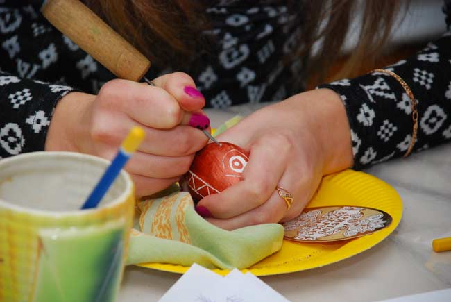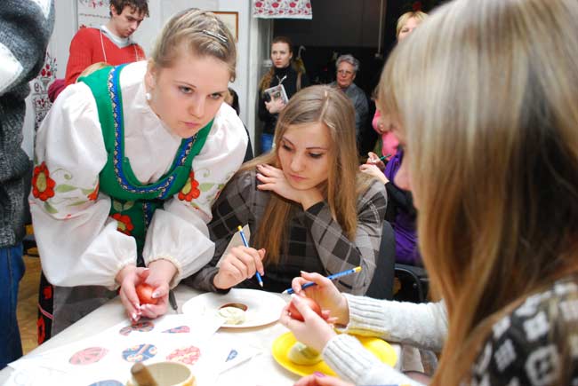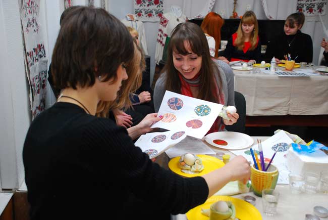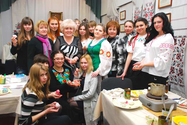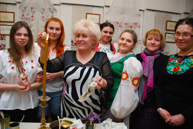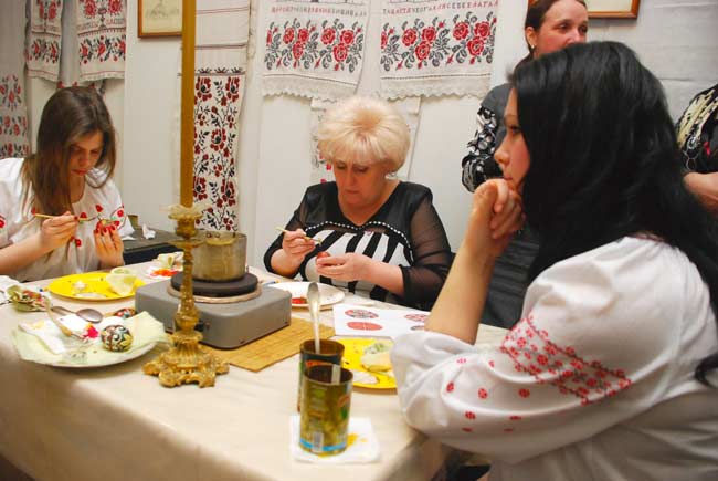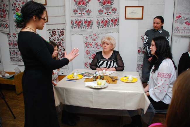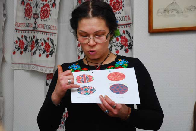 Урок писанкарства провела Наталья Боровская, член областной организации творческого объединения художников и народных умельцев «Натхнення», член студии-клуба «Славяне», а также участница всеукраинских выставок и фестивалей декоративно-прикладного мастерства. Мастерица отметила, что на мастер-классе предлагает участникам поработать в двух самых древних и сложных техниках - изготовлении дряпанок и писанкарства с использованием воска. Она успевала помогать участникам и рассказывать о древних писанках и их символике. Все участники вложили в писанки тепло своей души.