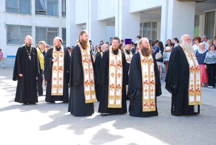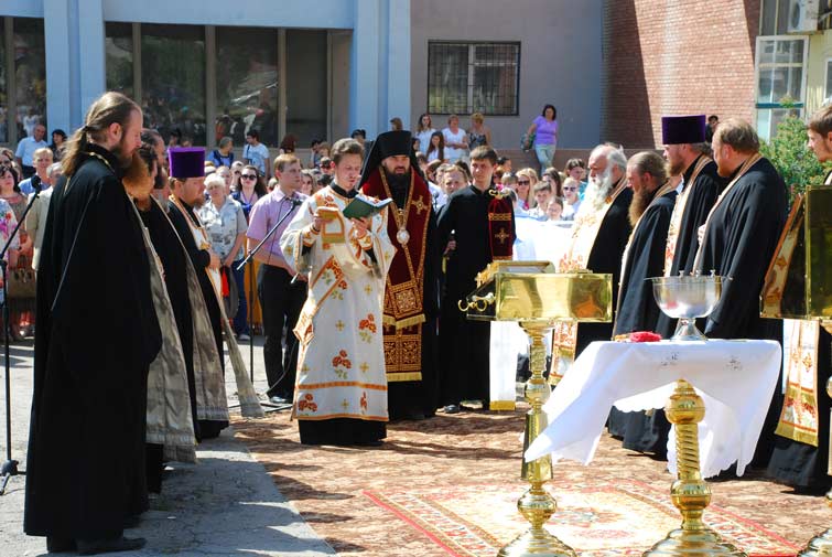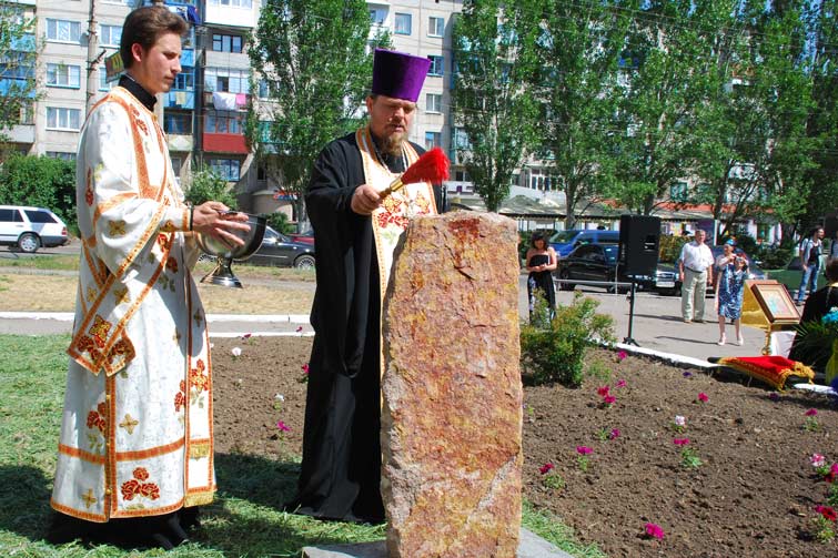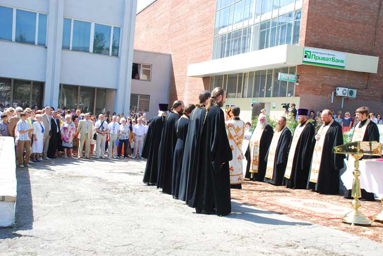 В 10 часов рядом с главным корпусом Донбасского государственного педагогического университета (ДГПУ) на ул. Ген. Батюка молебен за доброе дело сооружения памятника отслужил Преосвященный Митрофан, Епископ Горловский и Славянский.