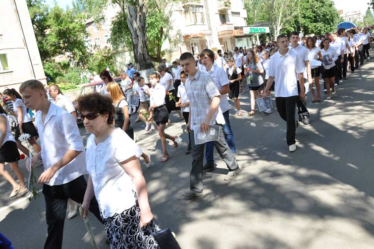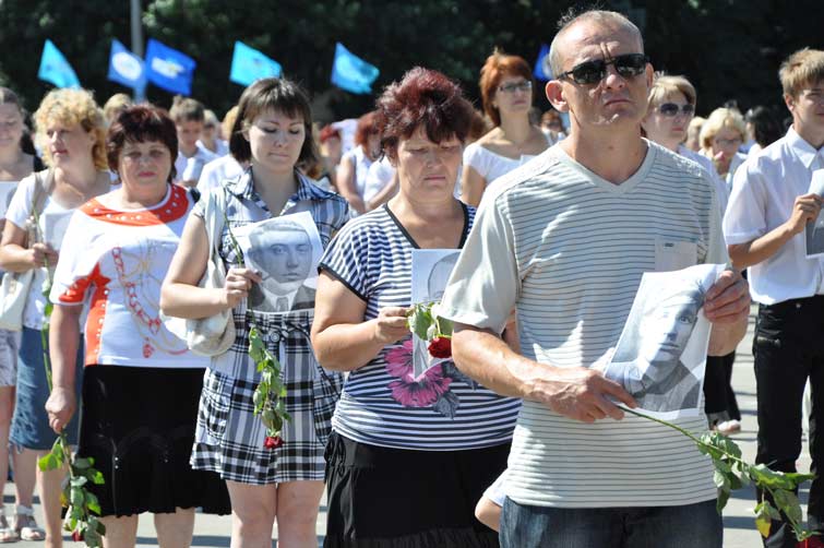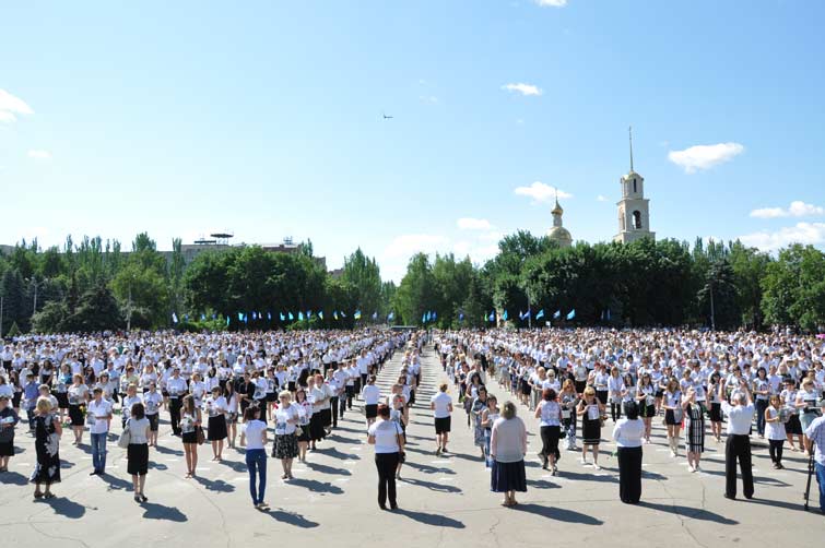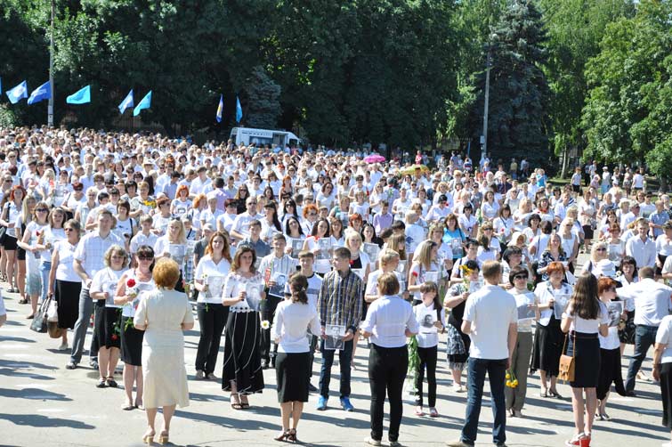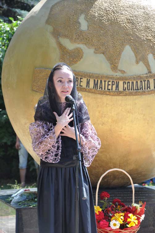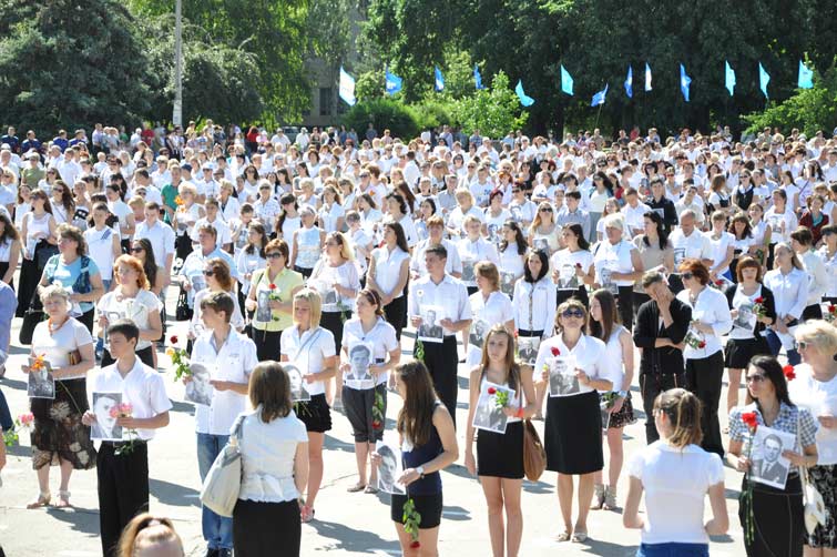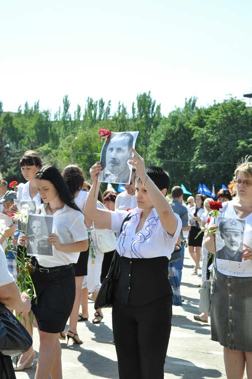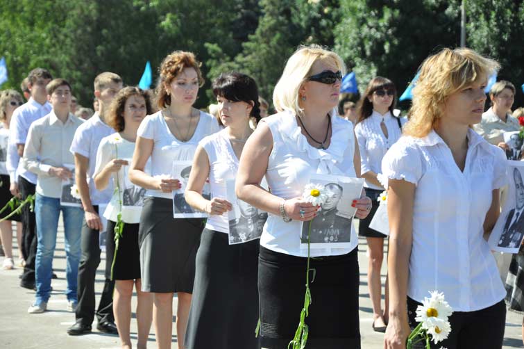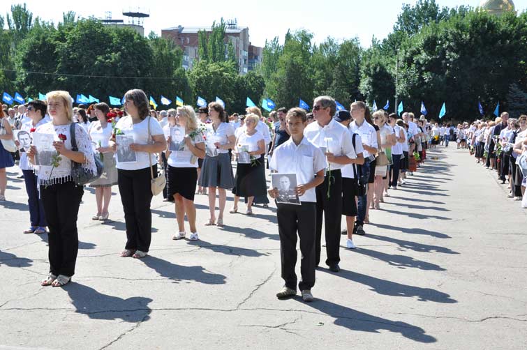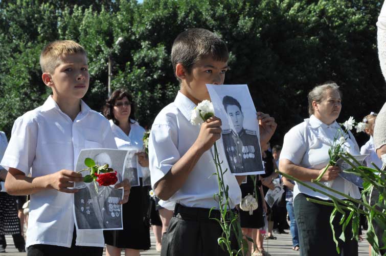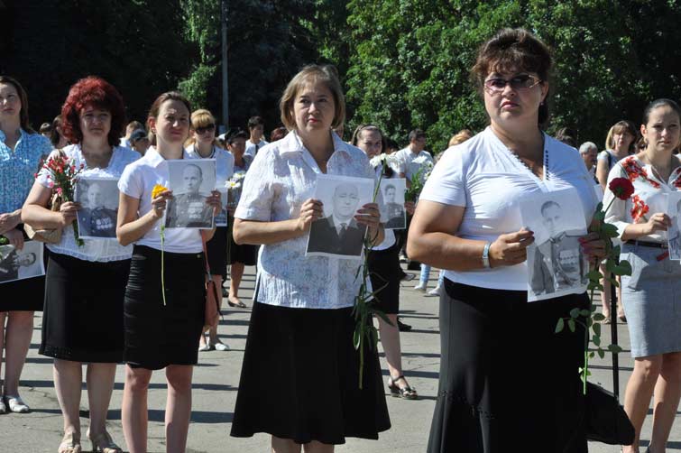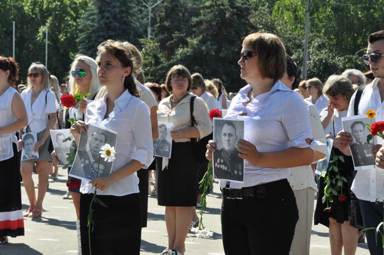 Со сцены звучали слова благодарности и уважения людям, которые пожертвовали собой во имя живущих сегодня. На площади почти десять тысяч человек держали в руках портреты участников боевых действий, защищавших наш край. С их портретами и цветами в руках многотысячная колонна людей начала шествие от центральной площади к памятнику Вдове и матери солдата. Митинг-реквием у памятника завершился минутой молчания и возложением цветов.