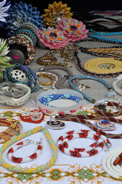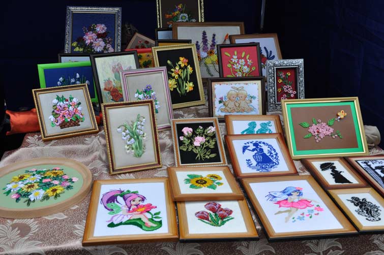 На ярмарке представляли посуду и сувениры из керамики, картины, изделия из дерева, украшения из бисера, мягкие игрушки ручной работы, работы с национальной вышивкой и много чего еще.