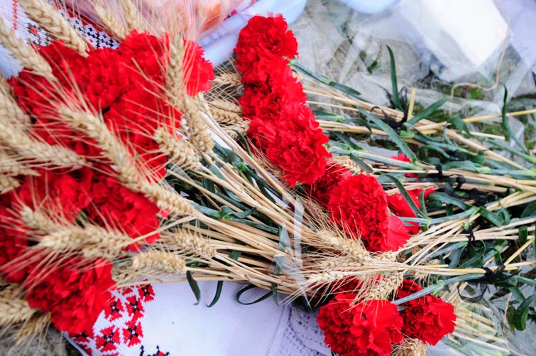 Присутствующие почтили память соотечественников, которые стали жертвами голодоморов, минутой молчания и помянули кусочком хлеба. К памятному знаку возложили цветы и колосья.