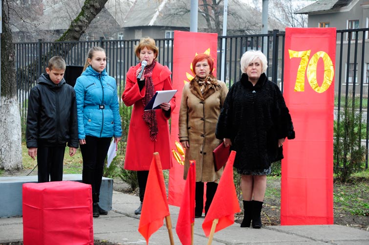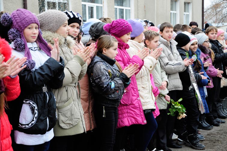 Одиннадцатая школа Славянска – единственная школа в Украине, в которой памятник герою находится на территории школы. У этого памятника выстроились торжественно школьники и учителя. На митинг приехали и почетные гости - Славянский городской голова Неля Штепа, управляющий делами исполкома городского совета Елена Огаркова, редактор Книги Памяти Эдуард Арутюнян.
