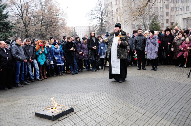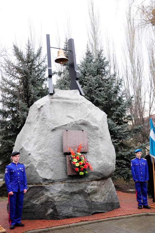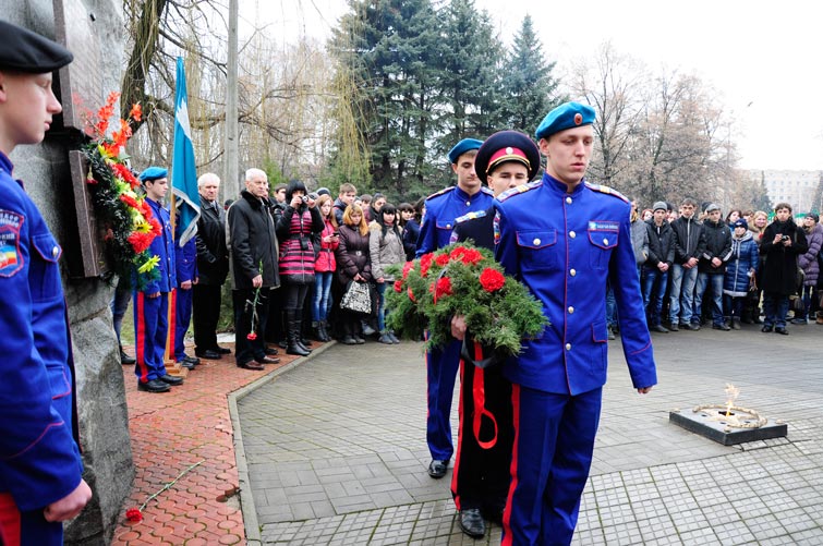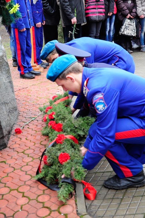 Настоятель Свято-Воскресенского храма Отец Виталий отслужил панихиду по погибшим воинам. Студенты Славянского профессионального машиностроительного лицея торжественно возложили к памятнику траурную гирлянду.