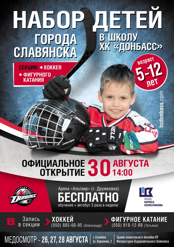 Хокейний клуб «Донбас» проводить набір до секції з хокею та школи фігурного катання для дітей м.Слов’янська віком від 5 до 12 років.