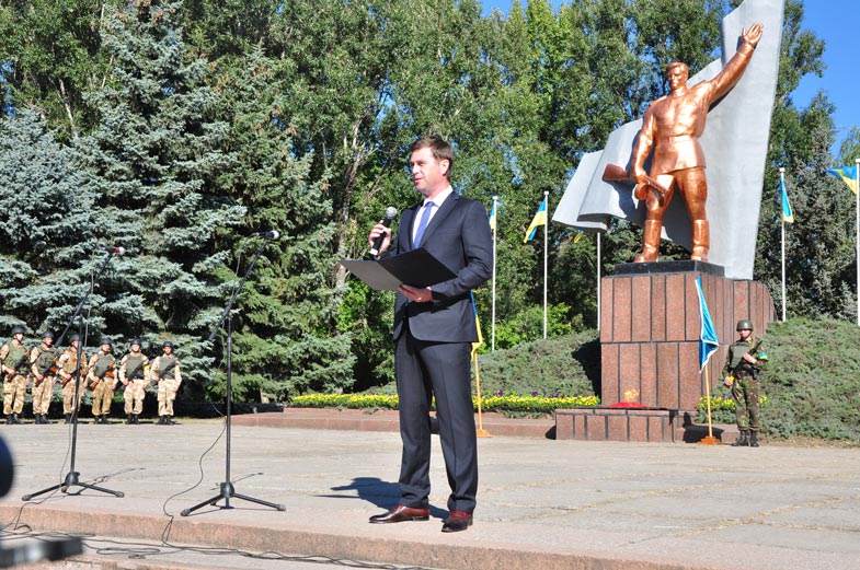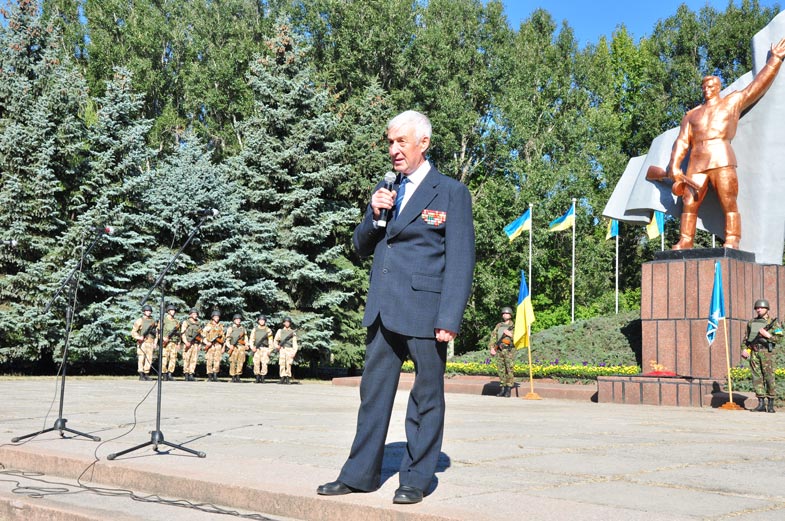 На урочистому мітингу біля Монументу Слави з вітальним словом до ветеранів звернувся секретар Слов'янської міської ради Павло Придворов.