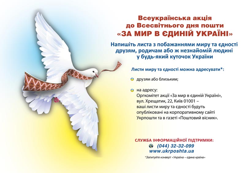 Національний поштовий оператор Укрпошта до Всесвітнього дня пошти оголошує всеукраїнську акцію «За мир в єдиній Україні».