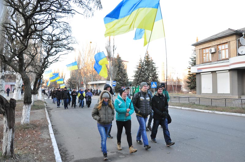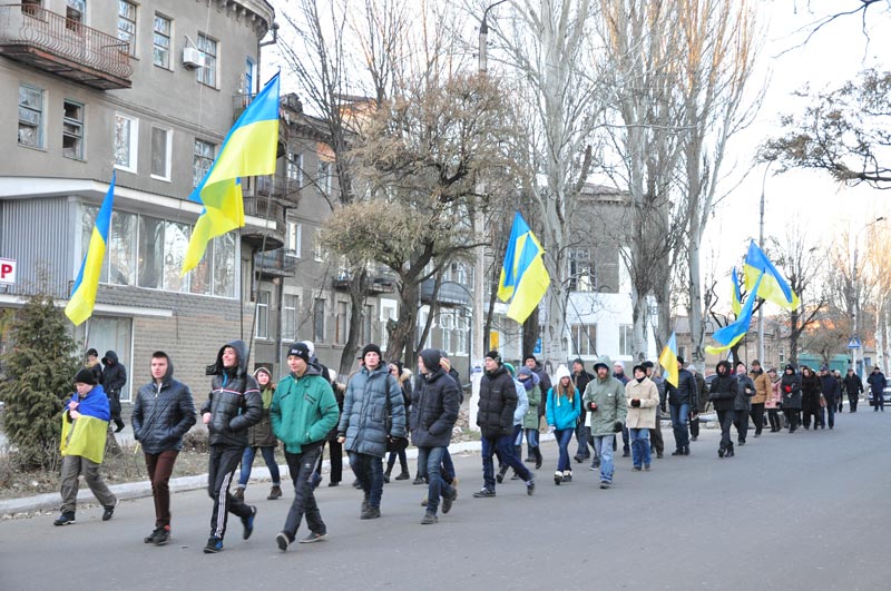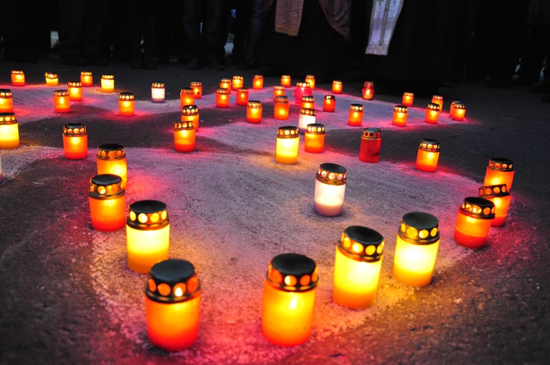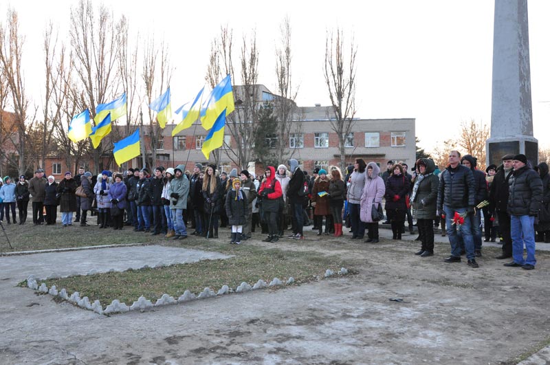 Представники органів місцевого самоврядування, підприємств, організацій, закладів міста, молодь, громадськість пройшли вулицею Т. Шевченка з Державними Прапорами України на яких були пов’язані чорні стрічки та лампадками.