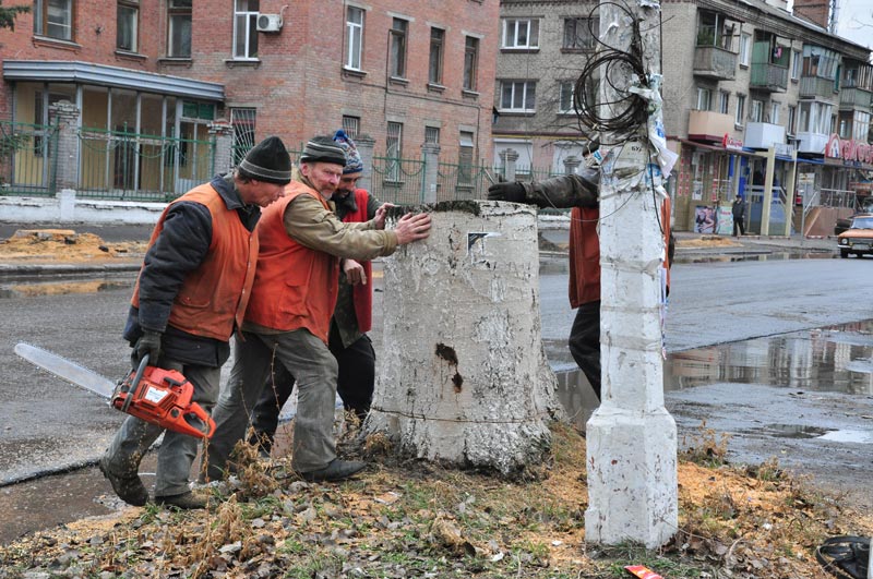 Зараз по вул.Свободи йдуть роботи по зносу старих тополь. Навесні 2015 року планується висадка нових дерев, а також укладання тротуарної плитки.