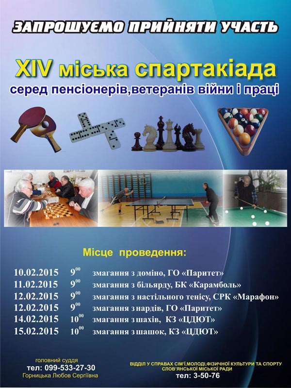 Відділ у справах сім'ї, молоді, фізкультури та спорту запрошує мешканців міста взяти участь у ХIV міській спартакіаді серед пенсіонерів, ветеранів війни та праці.