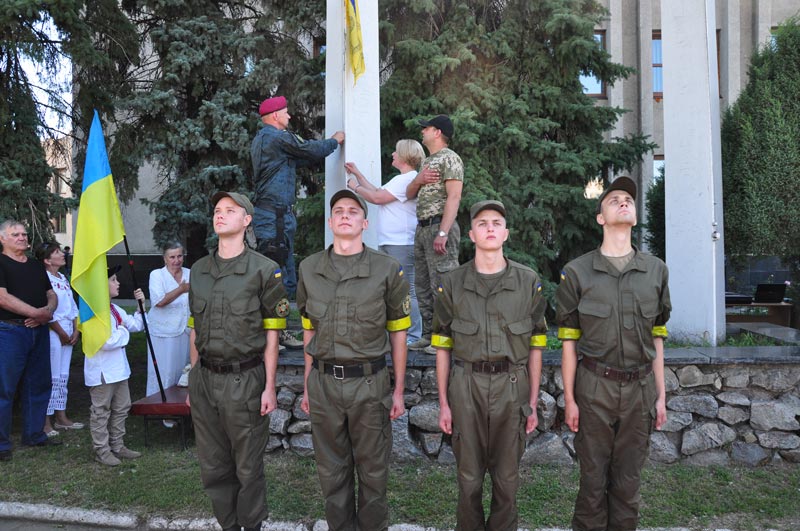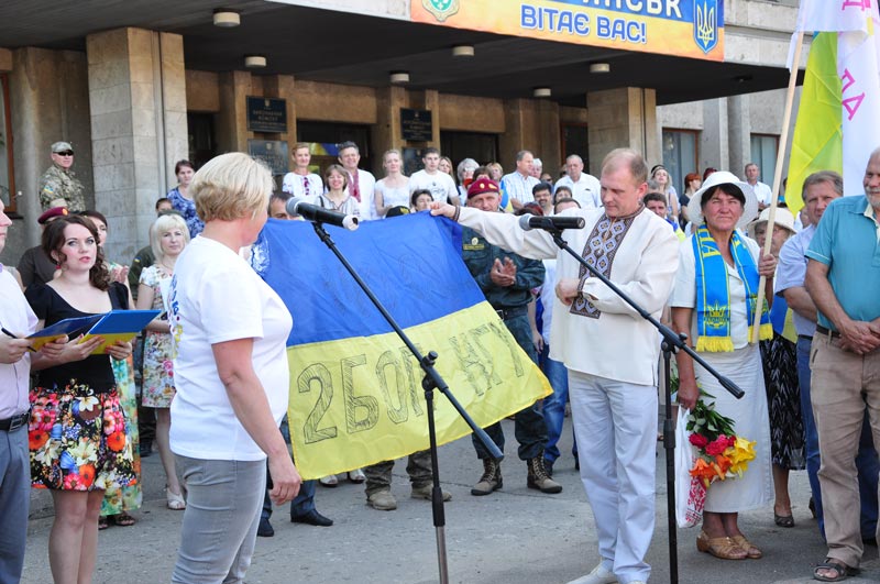В день відзначення Першої річниці звільнення Слов’янська від російсько-терористичних сил та відновлення мирного життя над будівлею міської ради також був піднятий Державний Прапор України, який майорів над Слов’янськом рік тому і був встановлений 5 липня 2014 року військовослужбовцями Національної гвардії України. Цей прапор символізує встановлення мирного життя, відновлення законності і правопорядку на нашій землі. А право підняти Державний Прапор України надали старшому солдату Михайлу Карпу, сержанту Павлу Пилипчуку (батальйон імені Героя України генерала Сергія Кульчицького Національної Гвардії України), Яресько Катерині Вікторівні - волонтеру, активісту Автомайдану «Харків».